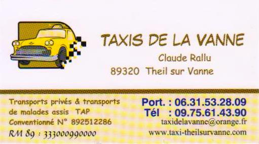 Transport![]() Taxis de la Vanne Claude Rallu AS: Theil sur Vanne 06.31.53.28.09 et 09.75.61.43.90 89320 Vaumort http://www.taxi-theilsurvanne.com |